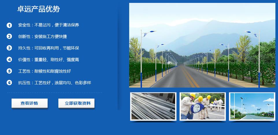 江蘇卓遠照明科技有限公司坐落于中國路燈之鄉——風景秀麗的揚州市郭集工業區,是集LED燈具、太陽 能路燈等產品的研發、制造、銷售、安裝服務于一體的現代化企業。主要生產LED燈具、太陽能路燈、錐形變徑燈桿、中高桿燈、景觀燈、庭院燈、交通信號燈及 景觀護欄等八大系列產品,產品暢銷國內各省區,銷售網絡遍布各省區。